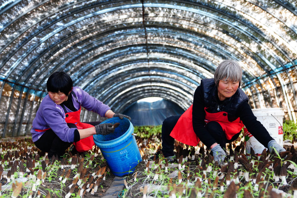 2024年3月20日,農民在山東省濟寧市微山縣驩城鎮袁堂華能光伏電站農光互補項目的大棚里采摘羊肚菌。該項目是采煤塌陷區綜合整治項目,集農光互補、漁光互補于一體。新華社記者 郭緒雷 攝