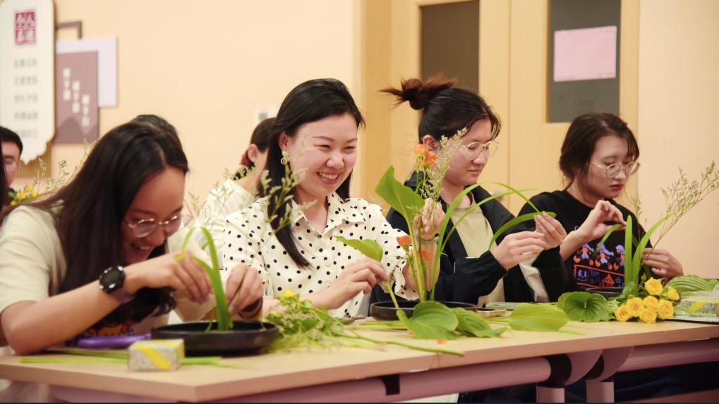 2024年5月28日,在江蘇省南京市鼓樓區寧海路街道黨群服務中心,鼓樓區青年夜校學員體驗插花課程。(羅斕 攝)