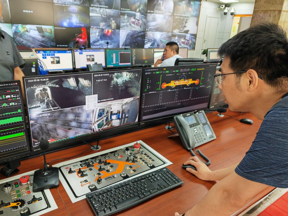 在山西省霍州市的山西焦煤集團李雅莊煤礦,綜采隊技術員在井上控制井下割煤機(2024年5月29日攝)。新華社記者 王勁玉 攝