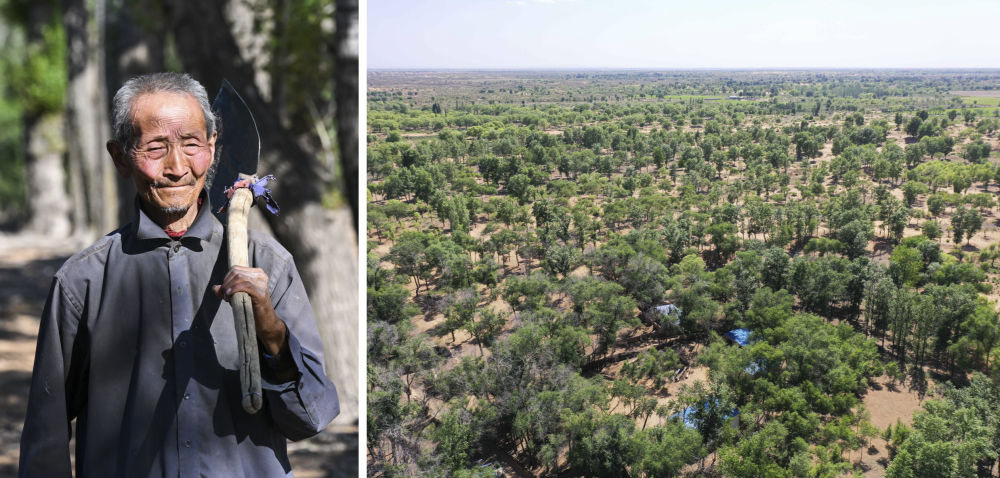 在新疆柯柯牙,當地政府推行以林果業為主的“誰建設、誰管護、誰投資、誰受益”荒漠綠化造林模式,在防護林網中套種蘋果、核桃、紅棗等經濟林,延續生態成果。