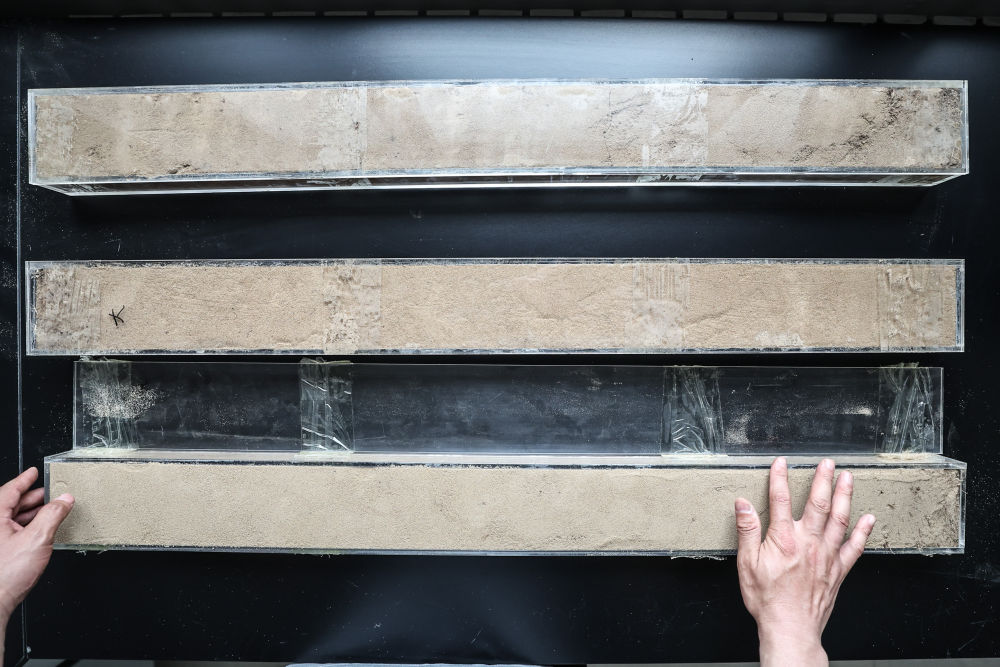 “草根博士”呂林有在遼寧省農業科學院沙地治理與利用研究所章古臺基地實驗室整理提取的沙地土壤剖面樣本(2024年5月30日攝)。新華社記者 潘昱龍 攝