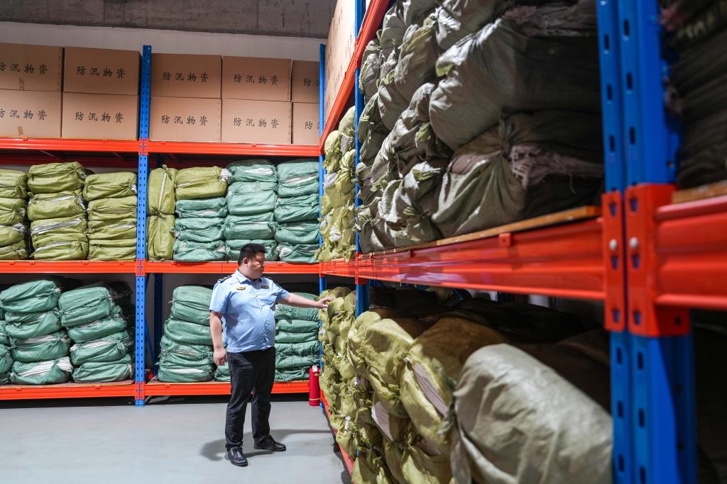 6月18日,在湖南省長沙市天心區防汛物資倉庫,應急管理局工作人員在檢查防汛物資。新華社記者 陳思汗 攝