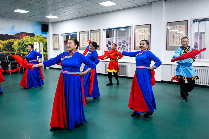 居民在內蒙古赤峰市松山區臨潢家園社區文體活動大廳跳舞(2024年6月19日攝)。新華社記者 李志鵬 攝