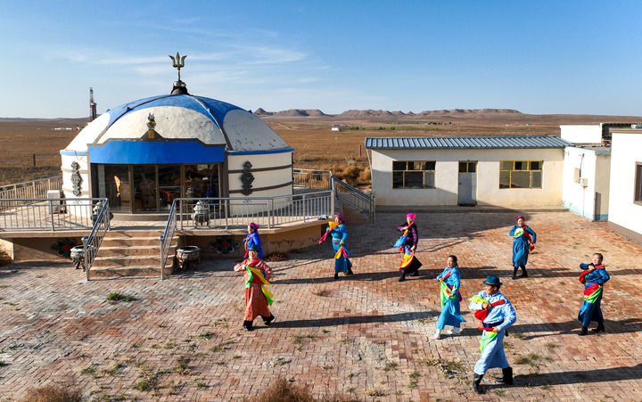 樂隊成員在內蒙古鄂爾多斯市鄂托克旗牧民道爾吉的蒙古包前跳舞(2023年10月16日攝,無人機照片)。新華社記者 貝赫 攝