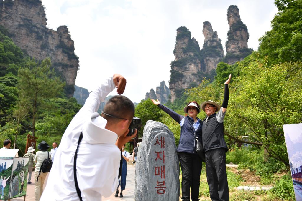 5月22日,在張家界國家森林公園十里畫廊景區,韓國游客在“三姐妹峰”前拍照留影。新華社記者 陳振海 攝