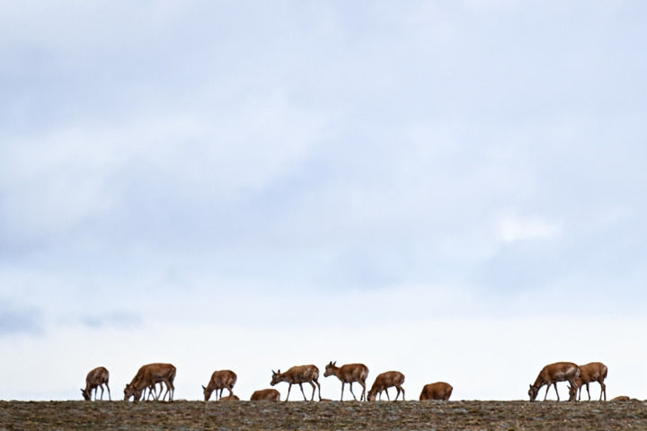 藏羚羊在青??煽晌骼镂宓懒旱貐^遷徙(2024年5月27日攝)。新華社記者 張龍 攝