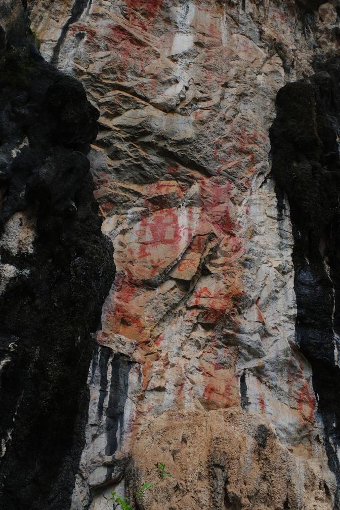 這是位于廣西寧明縣的一處巖畫點——花山巖畫,已列入《世界遺產名錄》,是左江流域的巖畫代表,是世界同類巖畫中單幅面積最大、畫面最集中、內容最豐富、保存最完好的一處巖畫,填補了中國巖畫類世界遺產的空白。