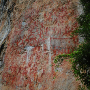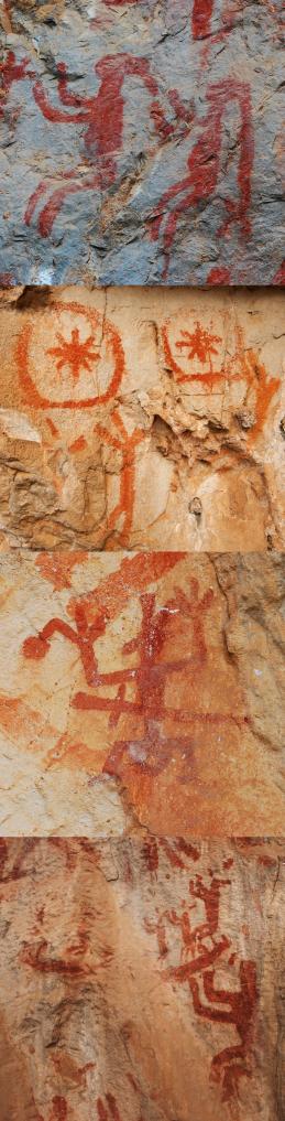 花山,又稱“畫山”“仙人山”,壯語譯為“岜萊”,即畫得花花綠綠的山。在尚未有文字記載的時代,壯族先民駱越人將其社會生活和藝術想象涂畫在這些懸崖峭壁之上。目前,崖壁上尚可辨認的圖像總數1900多個,涉及正身人像、側身人像、銅鼓圖像、渡船圖像等。