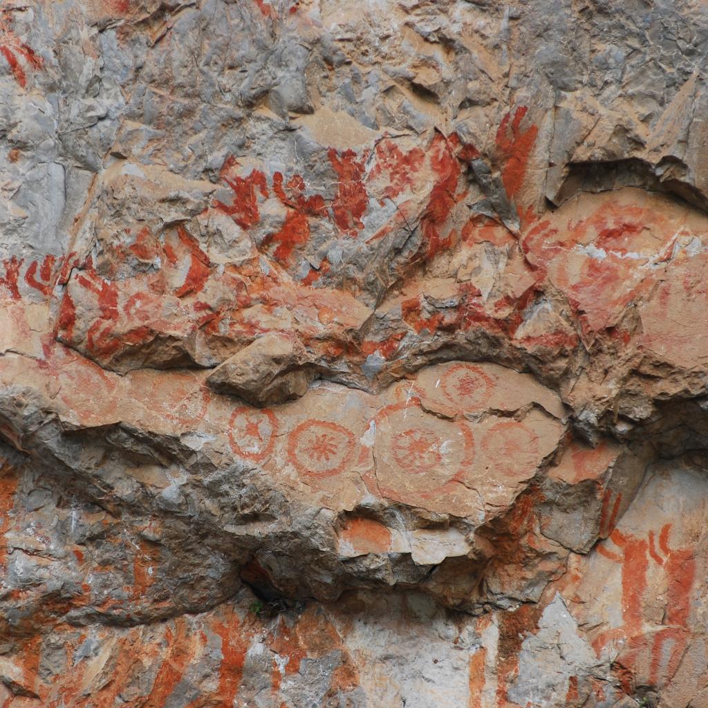 乘船數公里來到明江邊的花山懸崖之下,崖壁略顯內凹、層理清晰,向江邊傾斜。手腳張開、銅鼓在側、身佩環刀……多處紅色人像圖案就被繪于懸崖之上,這些人像圖案高約0.6至1.5米,最大的高達3.58米,悠悠江水拍打堤岸,時空的畫筆仿佛凝結于此。
