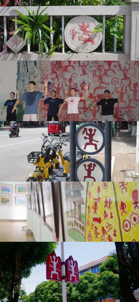 寧明縣花山文化傳承和保護中心的練功房里,舞蹈演員們正在編排舞蹈,從巖畫圖案汲取靈感進行改編,演員們反復練習、揣摩動作及走位。樓下的繪畫展廳里,巖畫圖案在孩子們的畫筆中飛躍懸崖、飛向天空。城區里,隨處可見巖畫圖案,“小紅人”從崖壁跳到了路燈、橋面、建筑物上。