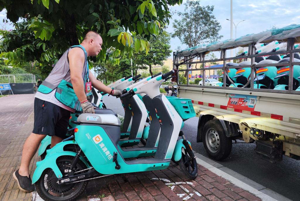 7月1日,廣西南寧市共享電單車公司運維人員在街頭調度車輛投放。新華社記者 楊馳 攝