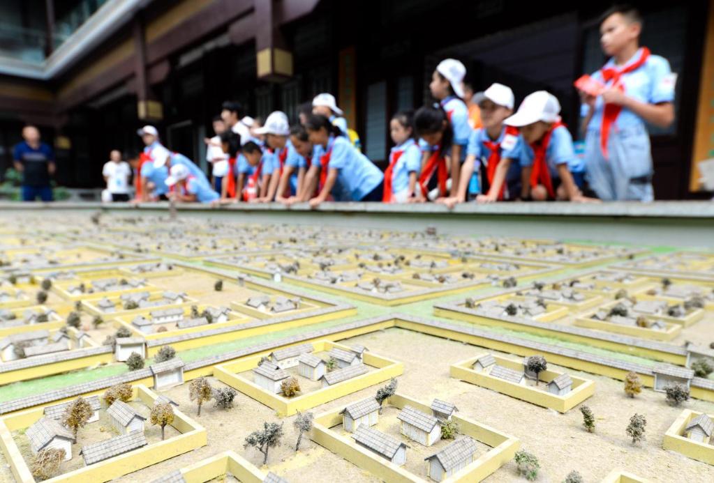 2019年8月7日,參加夏令營的少先隊員們在河北邯鄲臨漳縣鄴城博物館內參觀。新華社發
