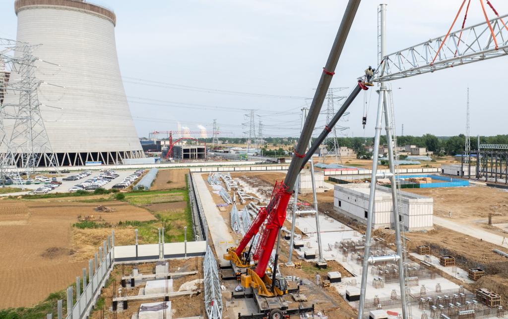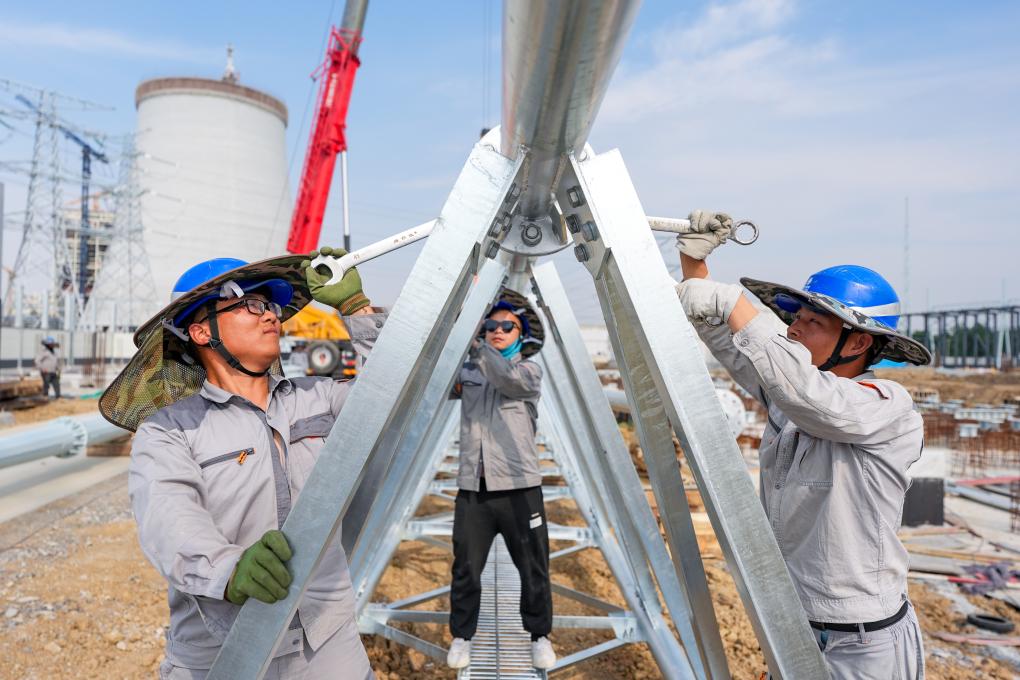 ↑安徽送變電工程有限公司施工人員在淮南潘集500千伏輸變電工程建設現場作業。