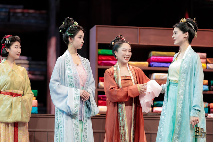 身著牡丹、海棠、梅花以及鸞鳳紋飾的大袖袍,手持小扇……舞臺上款款走向觀眾的南宋少女,卻有著一副外國面孔。