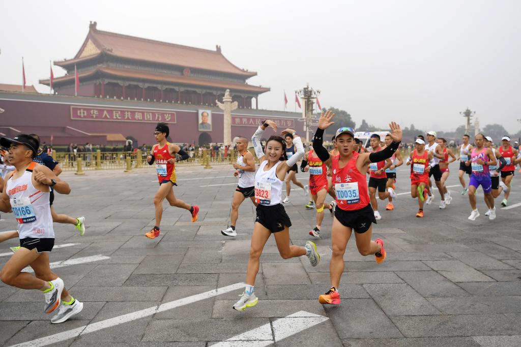 2023北京馬拉松參賽選手奔跑在長安街上↑