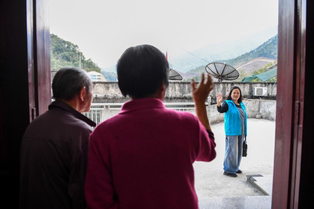 在賀州市昭平縣昭平鎮龍潭村,出診結束后,鄉村醫生陳坤(右一)與村民揮手告別(2021年2月23日攝)。