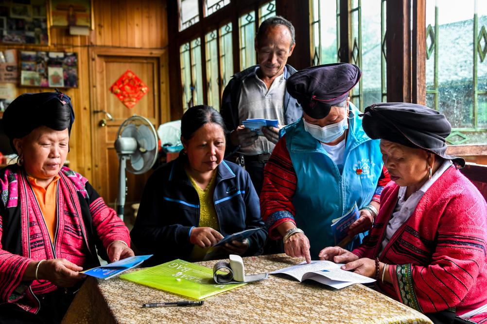 在龍勝各族自治縣龍脊鎮小寨村,鄉村醫生潘繼萍(右二)上門宣傳健康知識(2021年5月18日攝)。