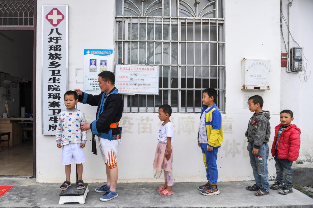 黎謀在村衛生所外給兒童測量身高體重(2020年4月29日攝)。