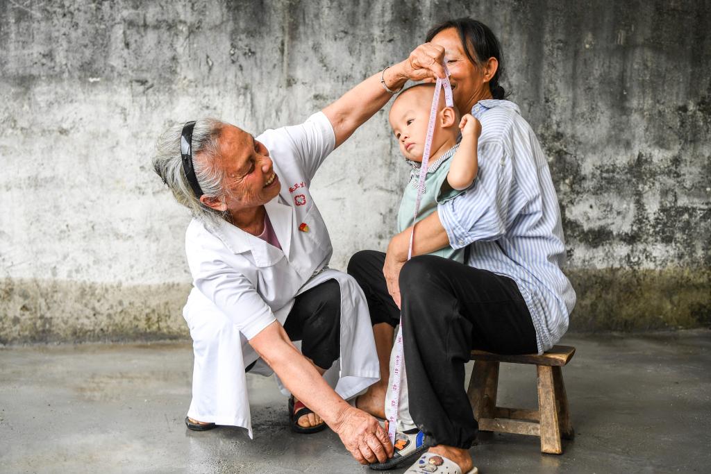 鄉村醫生王秋姣(左)上門體檢時給小朋友測量身高(2021年5月11日攝)。