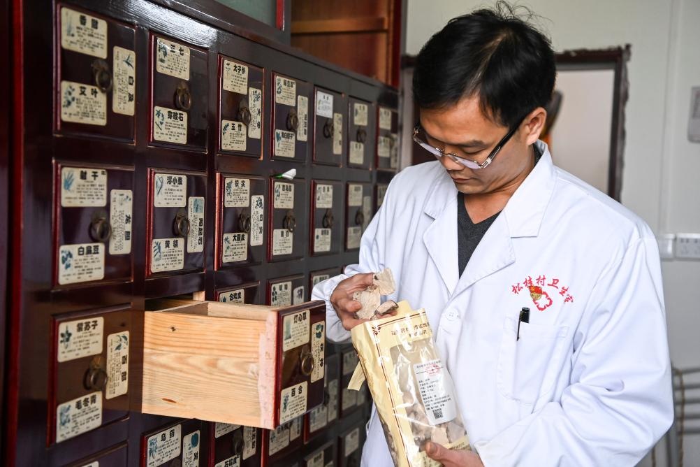 在鐘山縣石龍鎮松桂村衛生室,鄉村醫生潘紹瑜在檢查中藥材的儲存情況(2024年3月28日攝)。