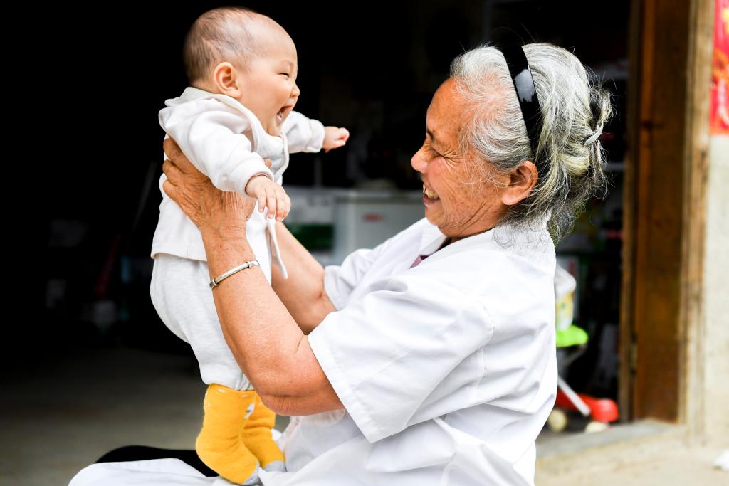 在鐘山縣兩安瑤族鄉竹梅村,鄉村醫生王秋姣上門為嬰兒體檢(2021年5月11日攝)。