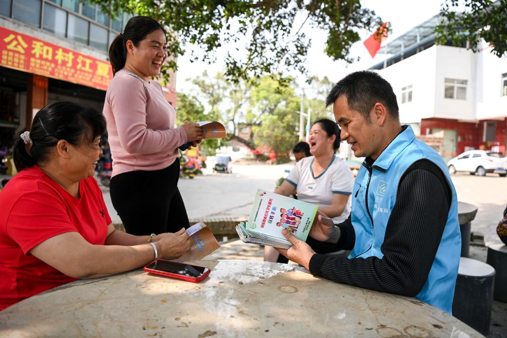 興業縣山心鎮公和村鄉村醫生鐘偉平(右一)給村民宣傳國家基本公共衛生服務政策(2024年2月19日攝)。