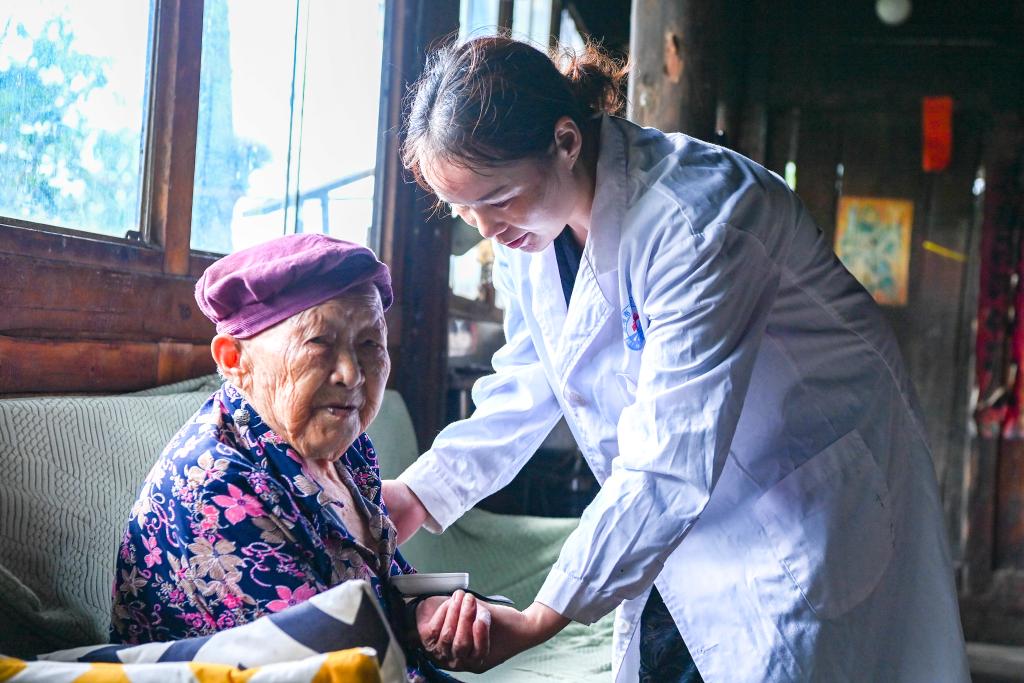 當我見到98歲高齡的黃桂姣時,她正坐在自家二樓的沙發上配合鄉村醫生楊盛祺測量血壓。這位近百歲高齡的老人常說:“我趕上了好時代,有醫生定期上門為我做體檢是一件曾經想都不敢想的事情?!?/p>