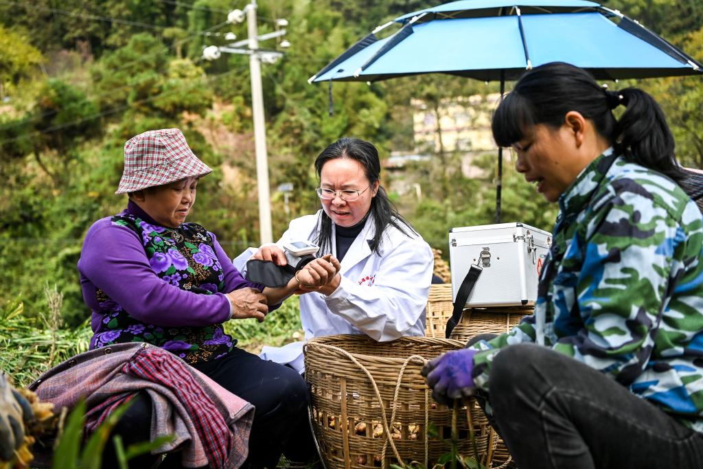 鐘山縣花山瑤族鄉林坪村鄉村醫生唐麗紅(左二)在田間地頭給村民測量血壓(2023年12月6日攝)。
