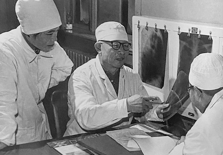 1980年1月16日,中日友好醫院首任院長辛育齡(中)在內蒙古結核病院與胸外科醫師討論病例(翻拍照片)。 新華社發