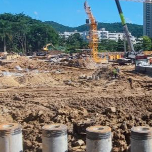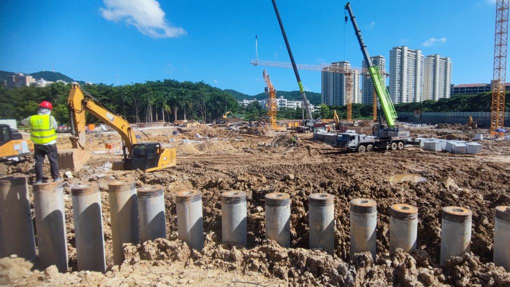 挖掘機揮舞鐵臂,渣土車來回穿梭。三亞市海羅片區城市更新項目(起步區)市場化商品房項目施工現場一派繁忙,工人們正加緊進行土方開挖、基坑支護、渣土清理等工作。