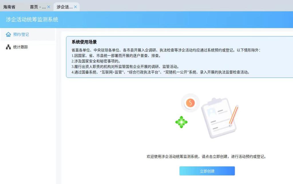 海南省涉企活動統籌監測系統預約/登記入口界面。