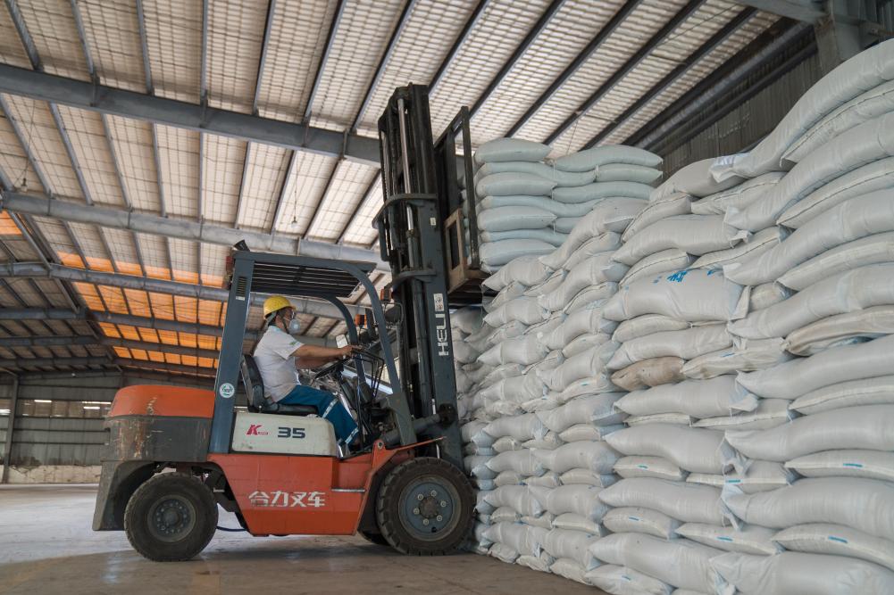 8月20日,工人駕駛叉車集中堆放車間剛生產的有機肥。新華社記者彭奕凱 攝