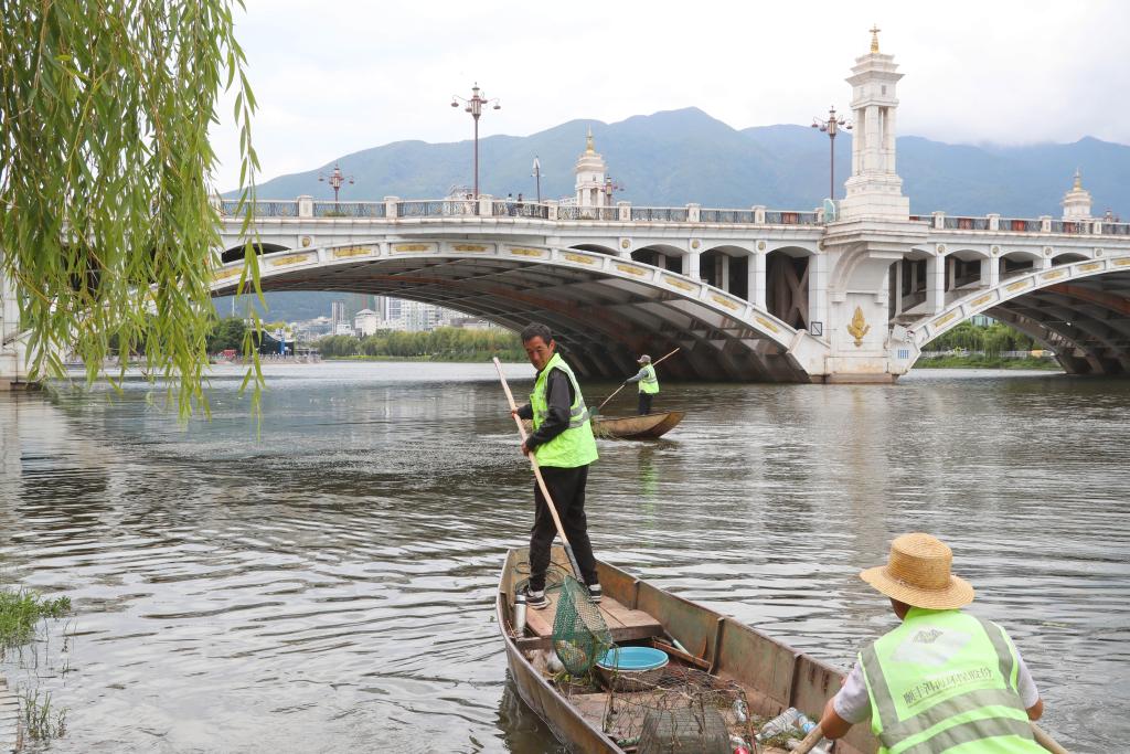 8月20日,工人在大理市西洱河上打撈水中的垃圾。新華社記者龔兵 攝