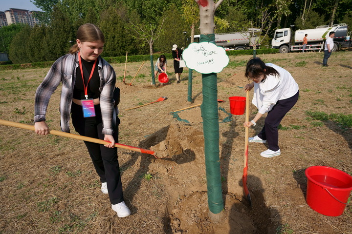 4月20日,美國馬斯卡廷中學學生與石家莊外國語學校學生在河北正定的“中美友誼傳承青年林”共同植樹。新華社記者 張粲 攝