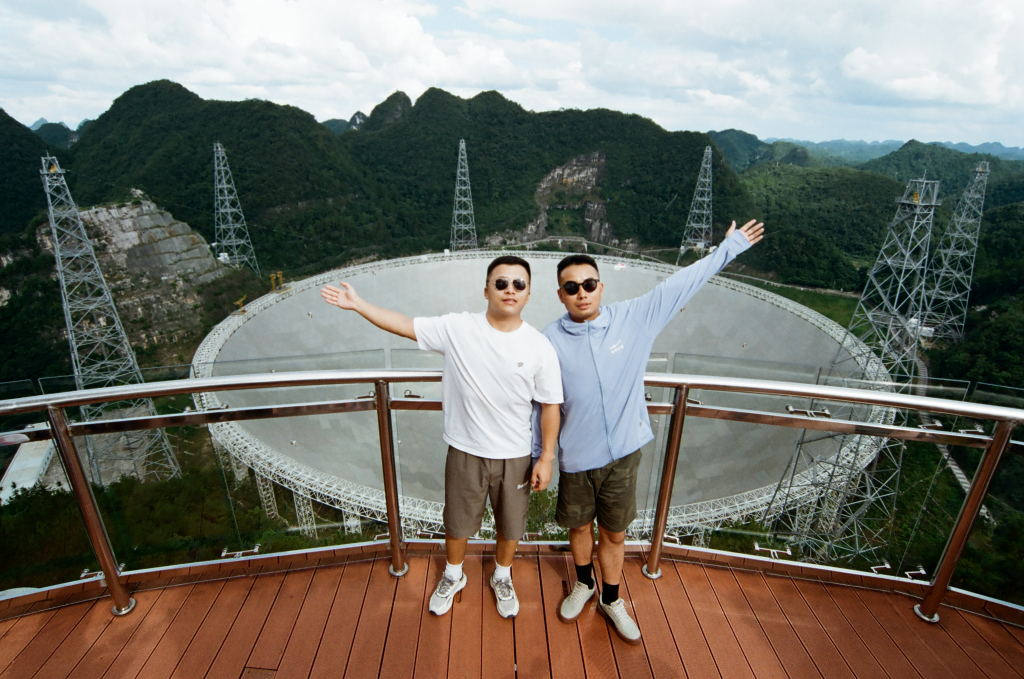 8月14日,游客在“中國天眼”景區觀景臺合影。新華社發