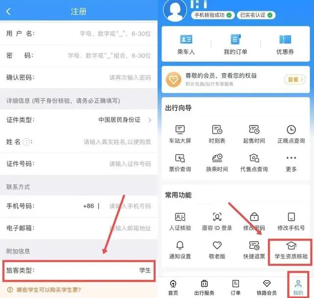第二步:打開鐵路12306App-我的-學生優惠資質核驗專區填寫相關優惠信息(姓名、證件號碼、學校和家庭所在地、預計畢業年份)-提交,即可購買學生優惠票。