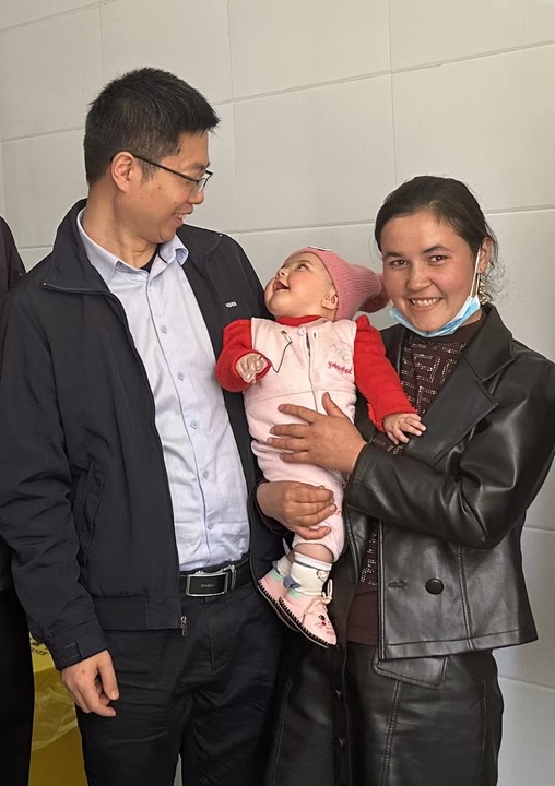 嬰兒康復后,朱家全(左一)今年3月在一次上海援疆醫療義診中偶遇了嬰兒和她的母親。受訪者供圖