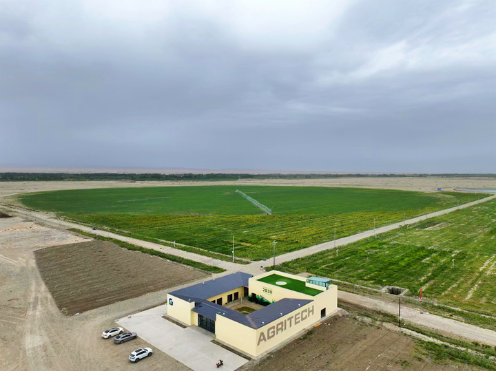 近日,記者前往位于莎車縣亞喀艾日克鄉的一片戈壁灘。戈壁灘上長出綠意盎然的苜蓿、油菜和向日葵。兩個面積共1700畝的巨大綠色圓形地帶與周圍黃褐色的戈壁灘形成鮮明對比,植被生機一掃戈壁荒蕪。