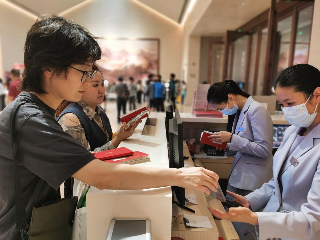 6月7日,觀眾在中共一大紀念館領取免費的《光榮之城 紅色“滬”照》尋訪手冊,可根據手冊指引參與“紅色印記”上海城市紅色尋訪活動。新華社記者 陳愛平 攝