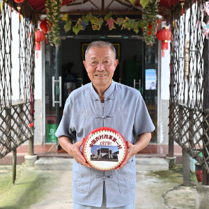 7月25日,“大包干”帶頭人嚴金昌在自家開辦的農家樂里展示小崗村旅游紀念品鳳陽花鼓。新華社記者 李鑫 攝