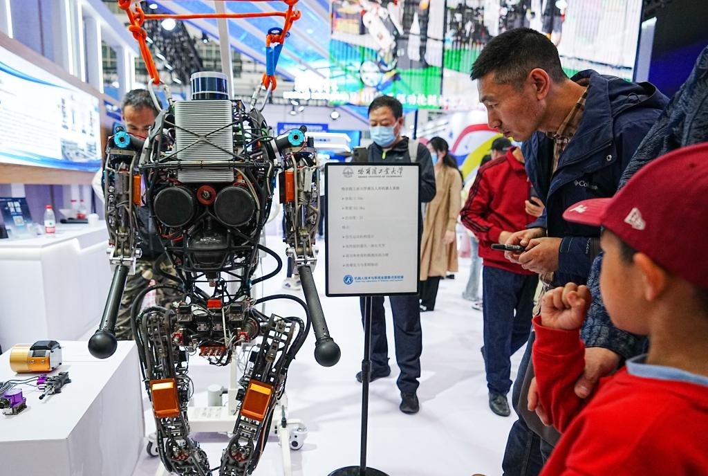 2024年5月19日,在第八屆中俄博覽會新質生產力科技成果展區,參會者在了解哈工大液壓人形機器人系統。新華社記者 王建威 攝