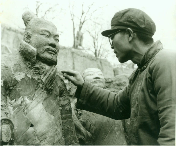 時任秦始皇兵馬俑考古隊領隊的袁仲一在陜西西安兵馬俑一號坑發掘現場進行文物清理工作(1974年攝)。新華社發(秦始皇帝陵博物院供圖)