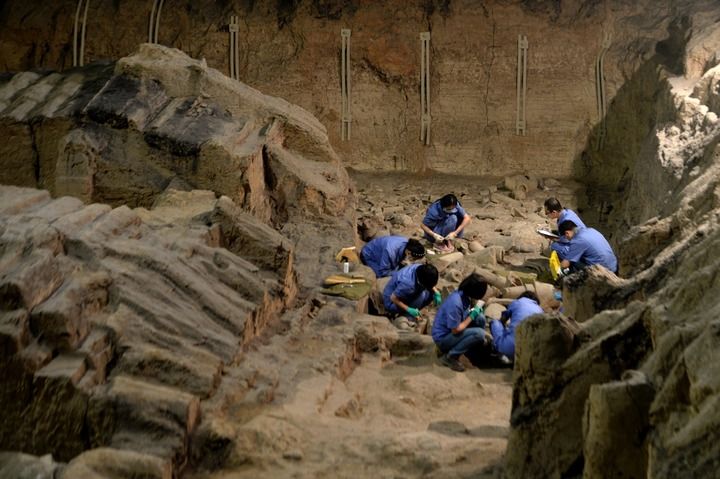 參與兵馬俑第三次發掘的考古人員在秦始皇兵馬俑一號坑內進行發掘清理(2012年6月9日攝)。新華社記者 李一博 攝