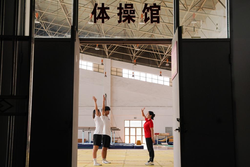 ↑9月3日,在安徽師范大學體操館,鄧琳琳(右)指導學生。新華社記者 杜宇 攝