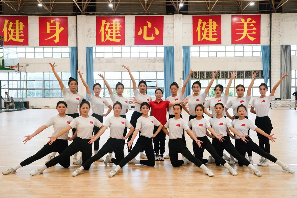 ↑9月3日,在安徽師范大學運動館,鄧琳琳(中)與學校健美操隊的成員合影。新華社記者 杜宇 攝