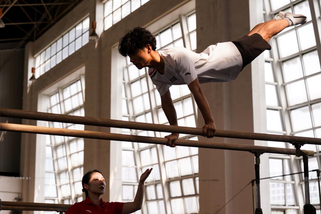 ↑9月3日,在安徽師范大學體操館,鄧琳琳(左)指導殷浩然。新華社記者 杜宇 攝