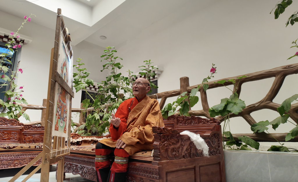 記者9月在西藏昌都市卡若區嘎瑪鄉見到92歲的嘎瑪德勒時,他坐在家中的暖閣里作畫,外孫丁增平措從旁協助。