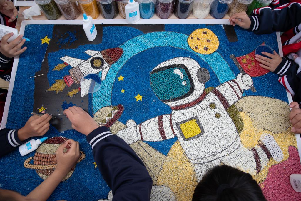 9月20日,在寧安市上官地村第七屆豐收節現場,孩子們在制作種子畫。