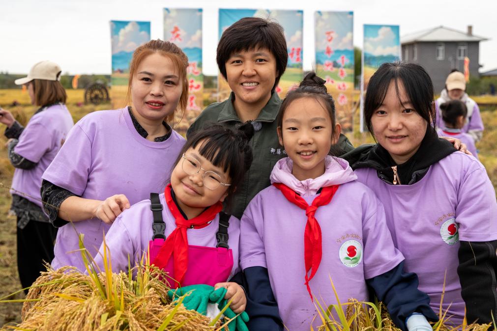 9月20日,在寧安市上官地村第七屆豐收節現場,陳雨佳和孩子們合影留念。