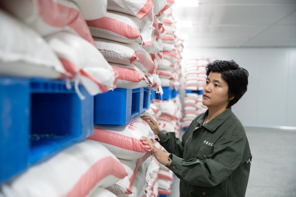 9月20日,在寧安市上官地村,陳雨佳在恒溫冷庫中檢查存米情況。